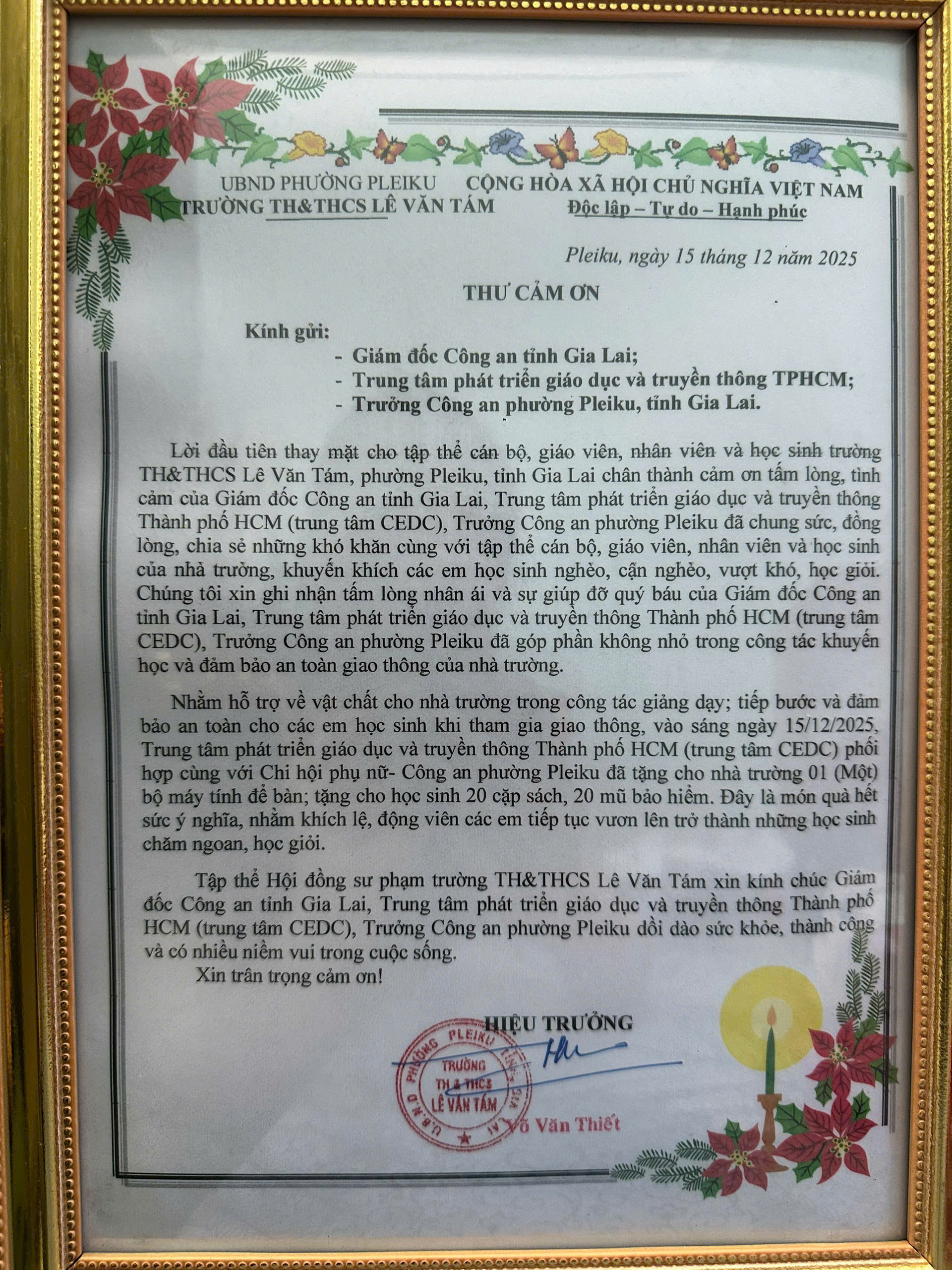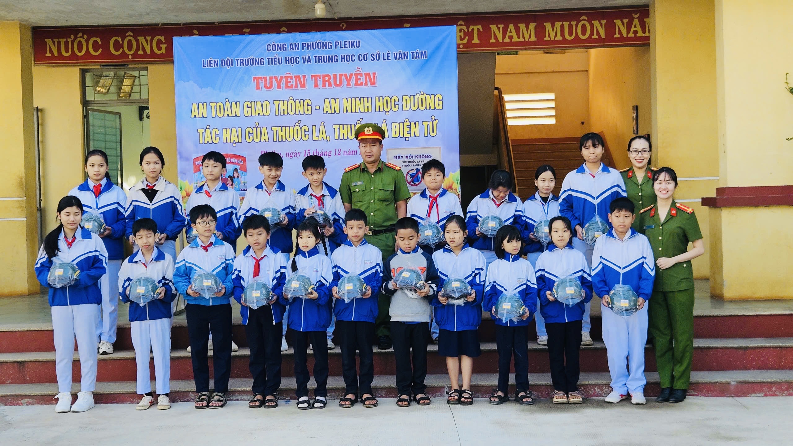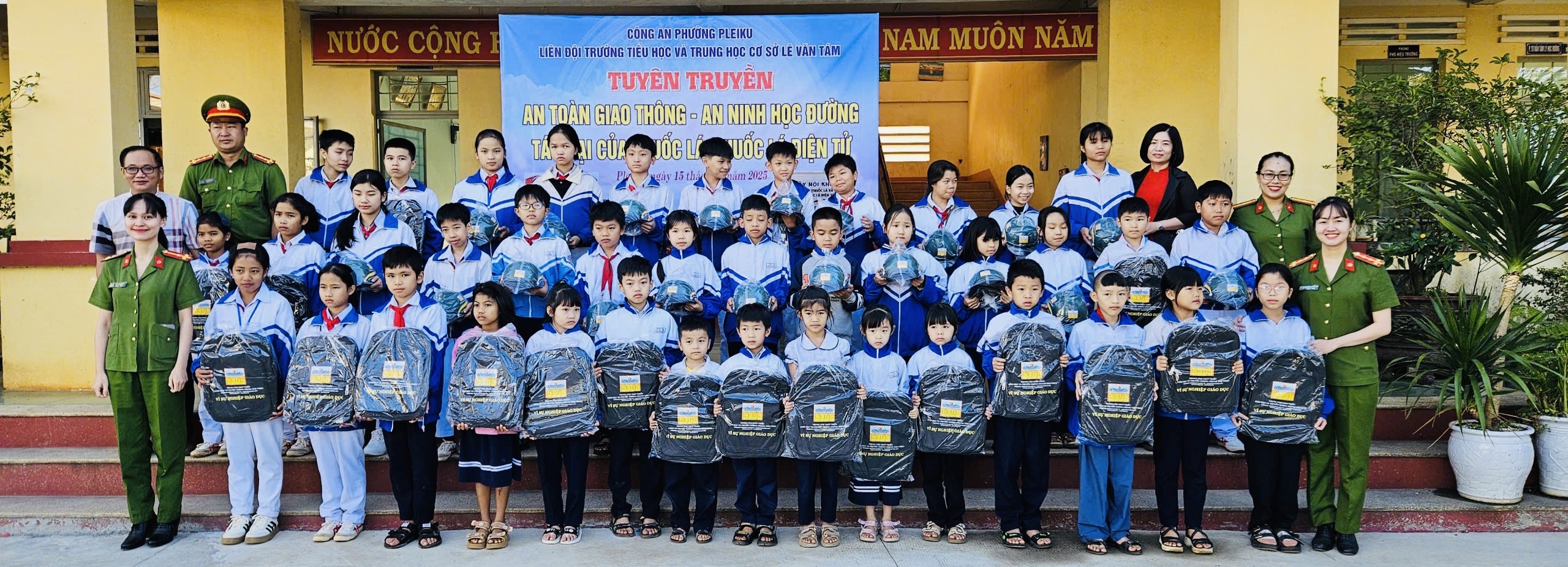 Nằm trong kế hoạch chào mừng Ngày Nhà giáo Việt Nam 20/11/2025, Trung tâm Phát triển Giáo dục và Truyền thông TP. Hồ Chí Minh (Trung tâm CEDC) tổ chức trao 200 phần quà tặng học sinh, sinh viên vượt khó hiếu học. Trong đó có Chi hội phụ nữ Công an Phường Pleiku cùng kết nối, đồng hành tổ chức trao tặng quà cho học sinh ở Trường Tiểu học & Trung học cơ sở Lê Văn Tám, Phường Pleiku, tỉnh Gia Lai. Qùa tặng gồm có 01 bộ máy tính để bàn, 20 balo, và 20 mũ bảo hiểm.